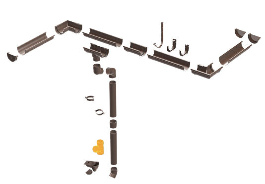 - Простой монтаж. В пластиковую конструкцию водостоков входят множественные комплектующие: переходники, воронки, уголки, колена, заглушки. С их помощью выполняется монтаж системы, которая собирается наподобие конструктора. При этом ничего подрезать и паять не нужно. Поэтому пластиковый водоотвод можно собрать самостоятельно